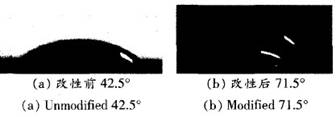 在其他條件保持不變的前提下,改性前后PVA商標膠的水接觸角如圖1所示。由圖1可知:液滴在改性前的PVA膠膜表面上更容易鋪展、浸潤;接觸角由改性前的42.5。增至71.5。,說明改性后PVA商標膠的表面疏水性有所提高。